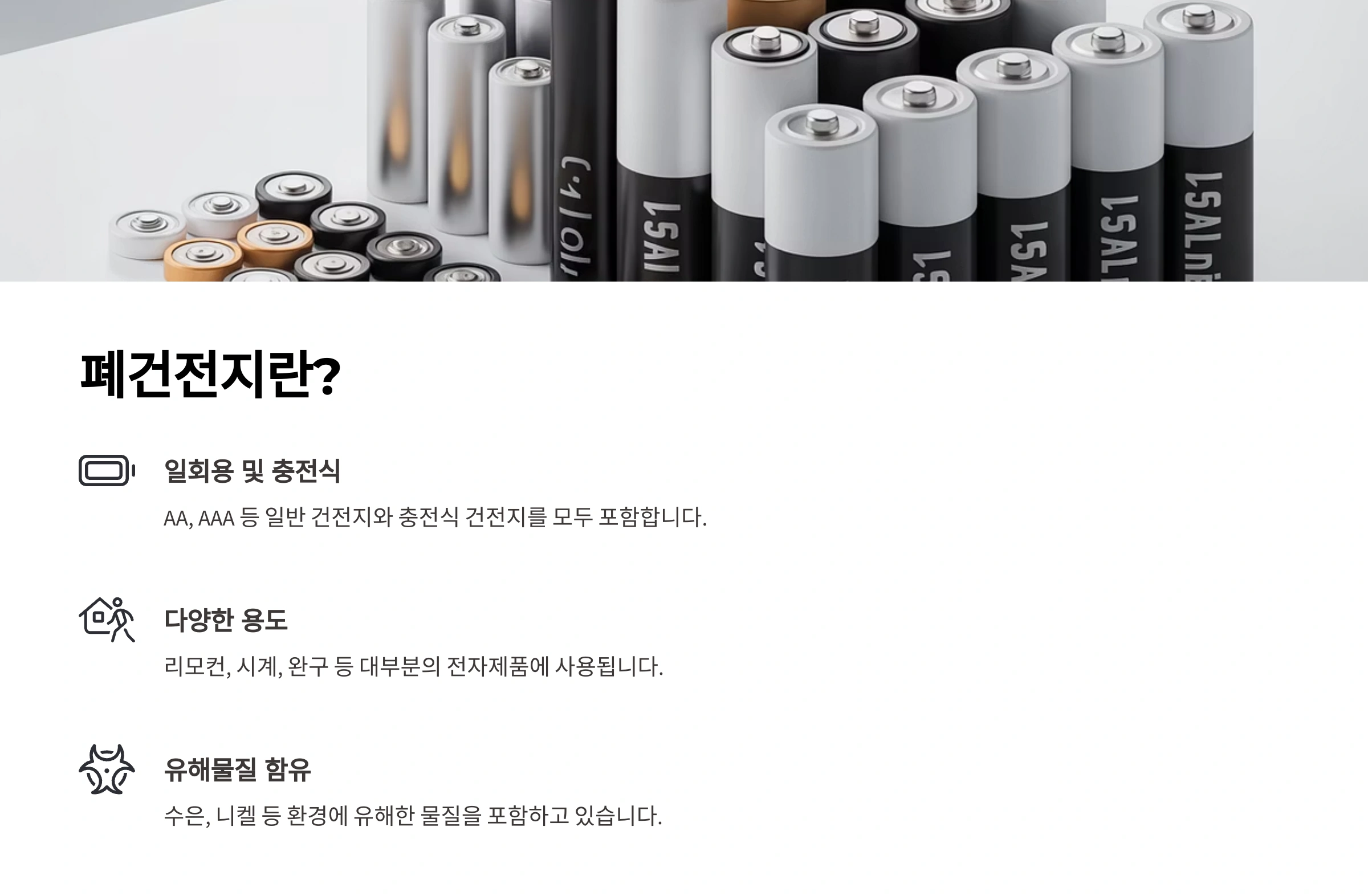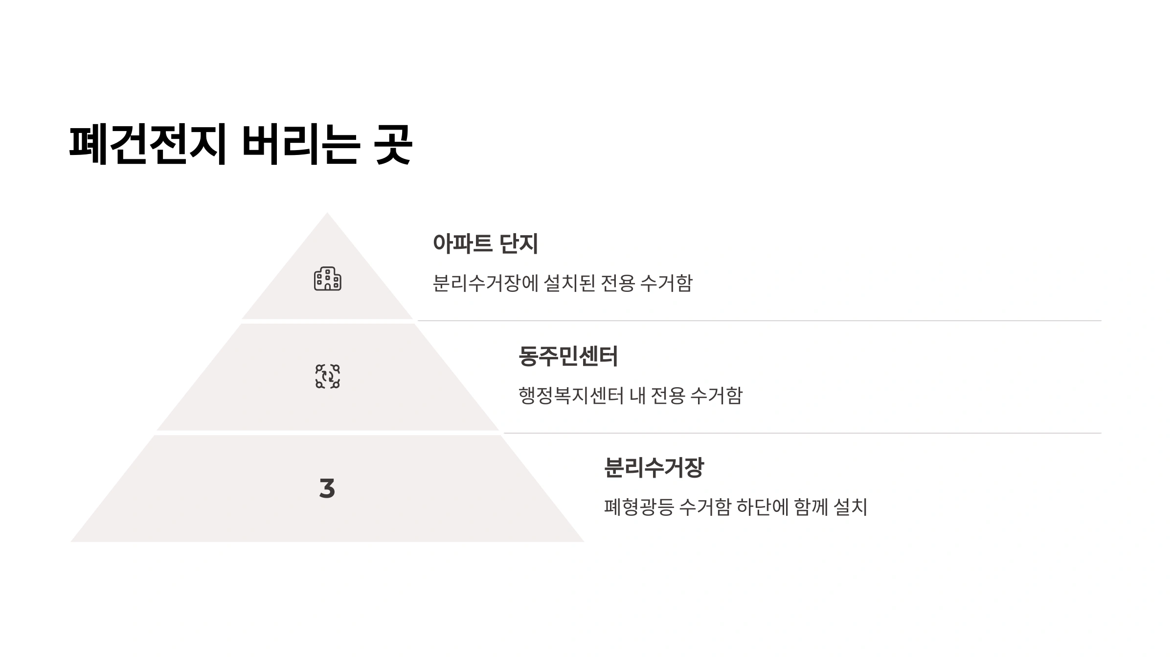 | 폐건전지 전용 수거함 | 아파트, 빌라 등 공동주택 / 주민센터(행정복지센터) / 구청 | 가장 보편적이고 접근성이 좋은 방법. 일반 건전지와 함께 배출 가능. |