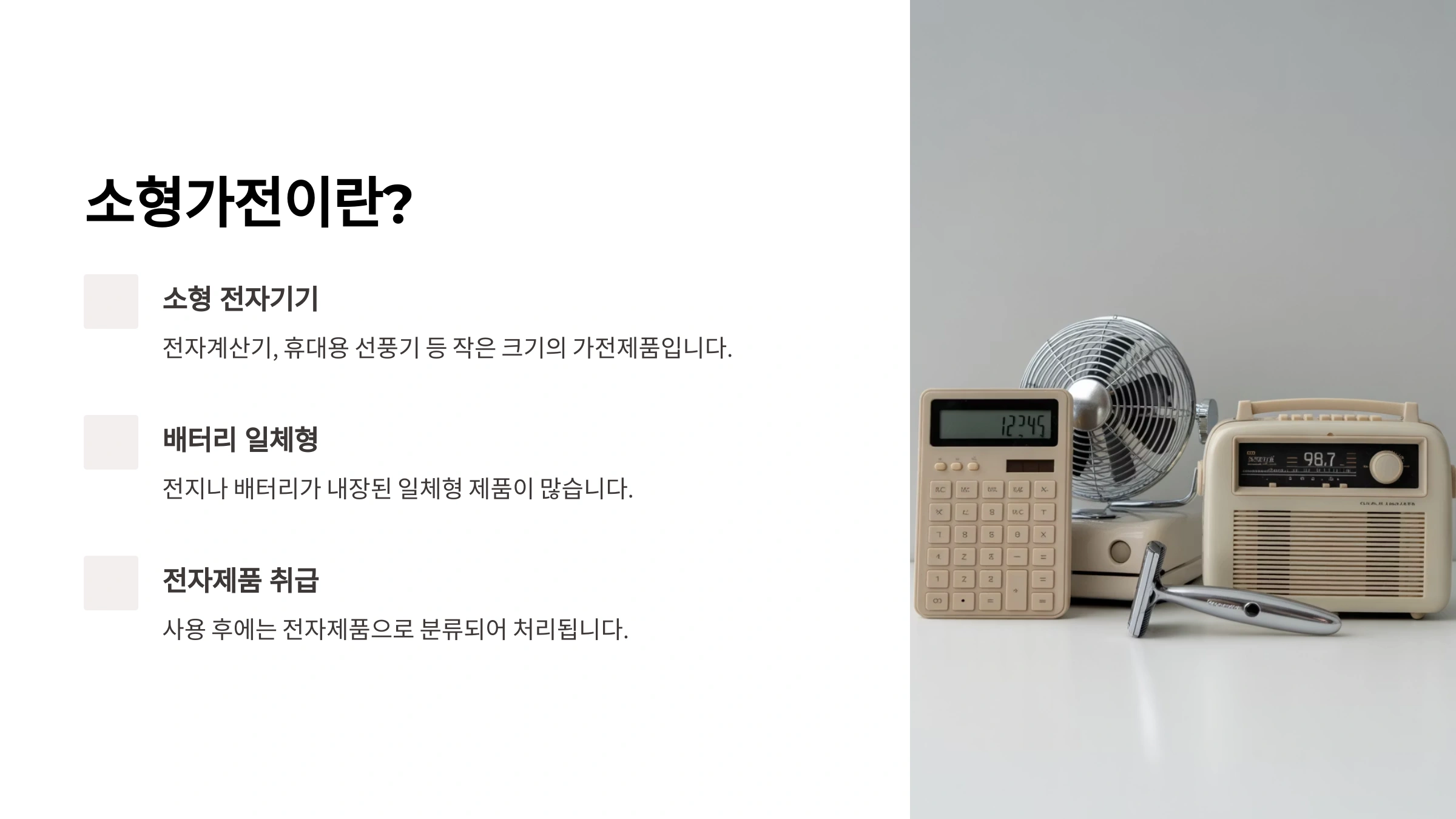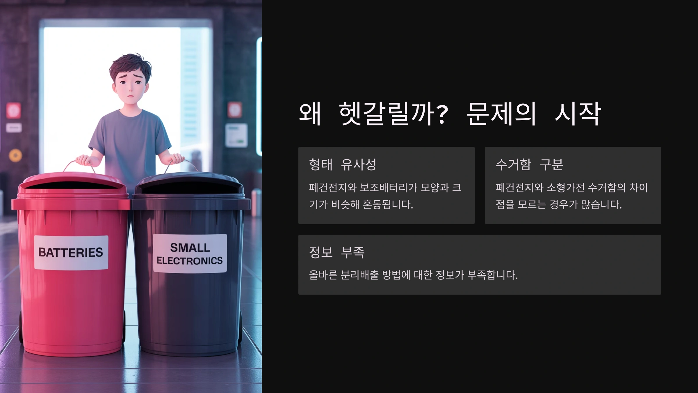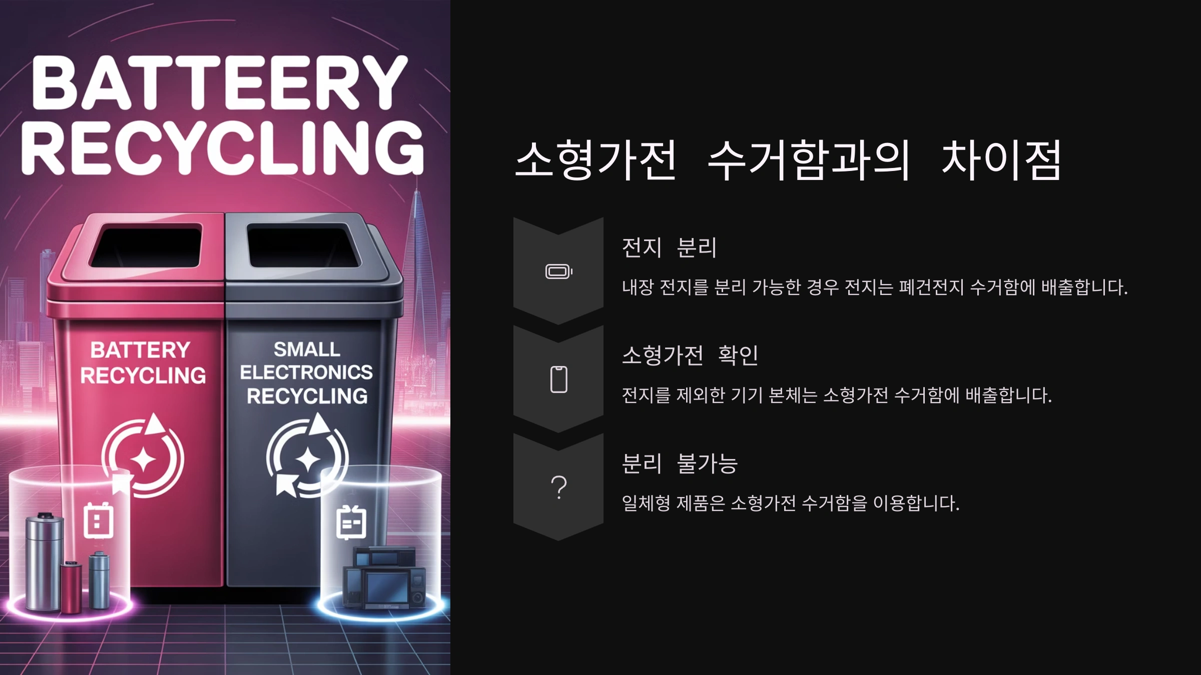 - 전용 수거함에 넣기: 이제 준비가 끝났어요! 위에서 알아본 폐건전지 수거함이나 소형 폐가전 수거함에 쏙 넣어주기만 하면 끝!