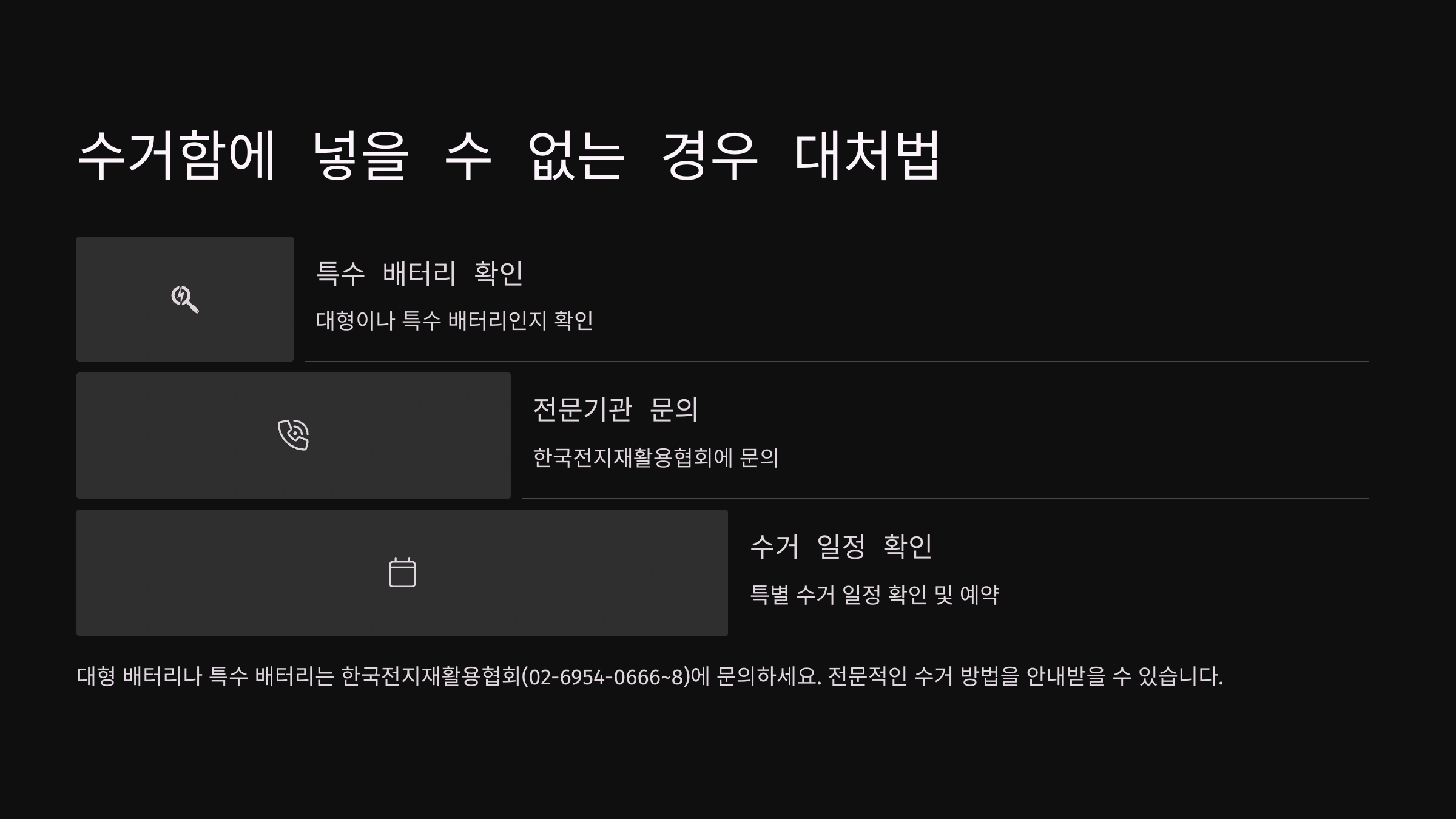 | 소형 폐가전 수거함 | 주민센터 / 일부 공동주택 | 휴대폰 충전기, 케이블 등 다른 소형 가전과 함께 배출 가능. |