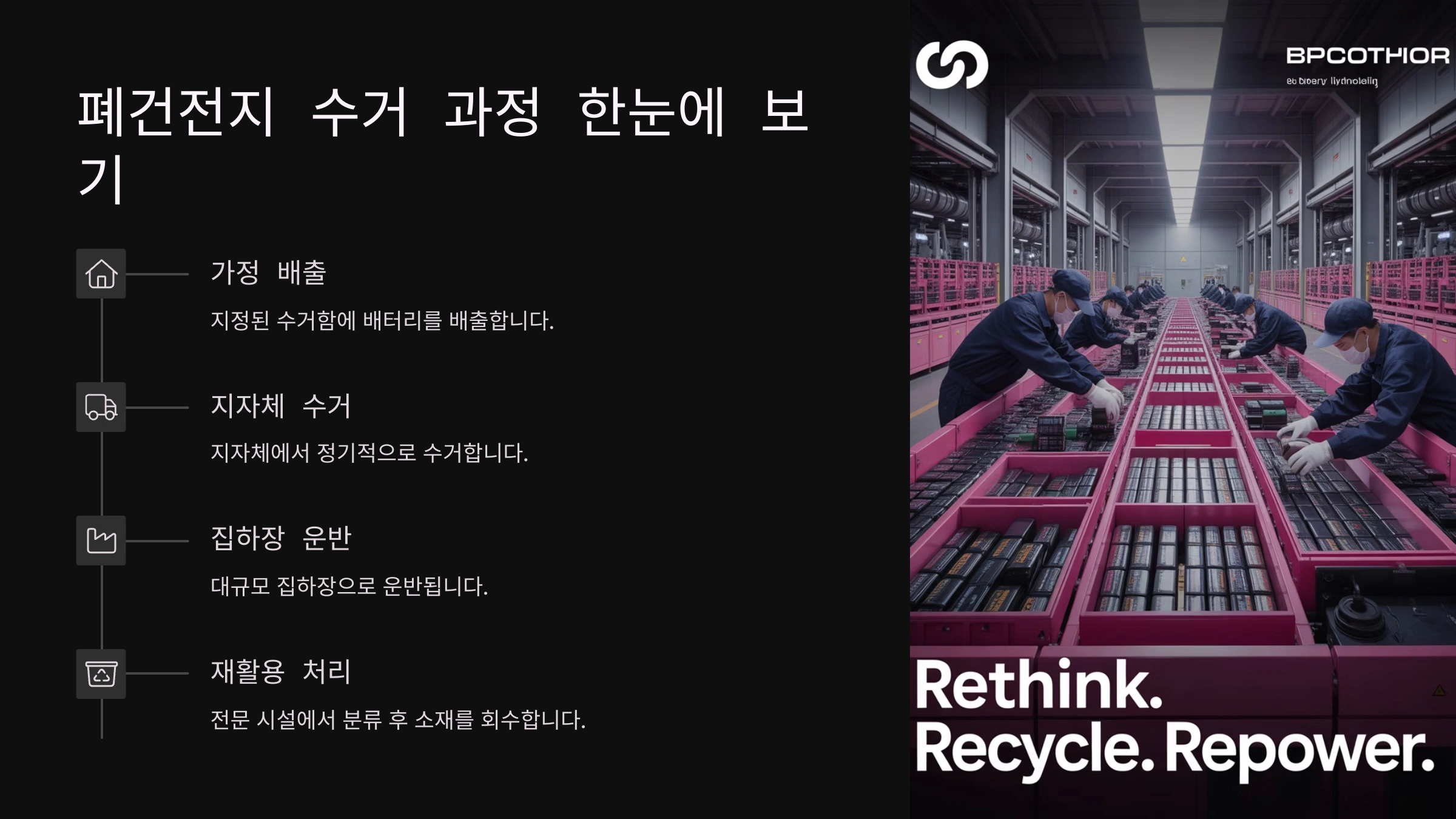 - 재탄생: 이렇게 회수된 금속들은 다시 새로운 배터리를 만들거나 다른 산업의 원료로 사용되어 귀중한 자원으로 재탄생하게 됩니다.