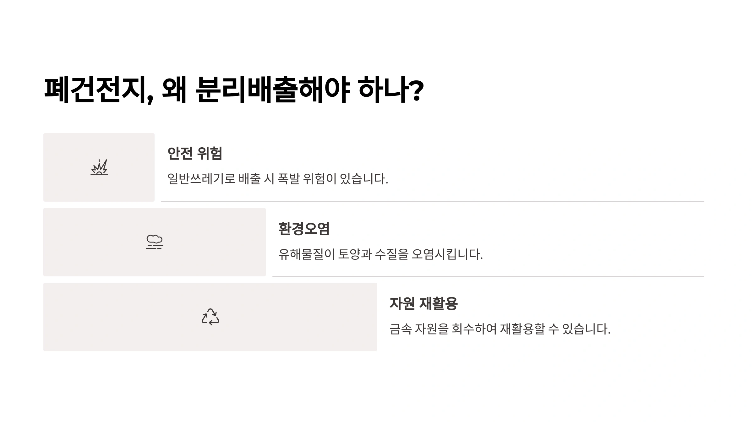 배터리 내부에는 니켈, 코발트, 망간과 같은 중금속과 유해 화학물질이 들어있어요. 이러한 물질들이 매립지에 그대로 묻히면 토양과 지하수를 오염시키고, 결국 우리 생태계 전체에 악영향을 미치게 됩니다. - 셋째, 귀중한 자원의 낭비! 💎