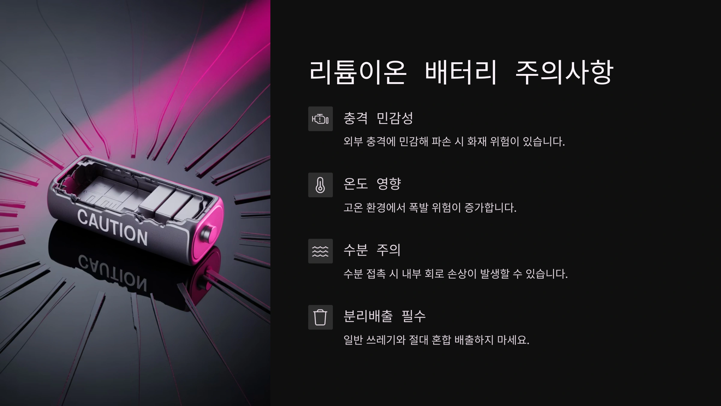 리튬 계열 배터리는 외부 충격에 매우 취약해요. 만약 일반 쓰레기와 함께 버려져 쓰레기 처리 과정에서 압축되거나 파손되면, 내부의 분리막이 손상되면서 순식간에 불꽃이 튀고 폭발할 수 있습니다. 이는 쓰레기 수거 차량이나 처리 시설에 큰 화재를 일으키는 원인이 되기도 하고, 환경미화원분들의 안전을 심각하게 위협할 수 있어요. - 둘째, 심각한 환경오염 유발! 🌍