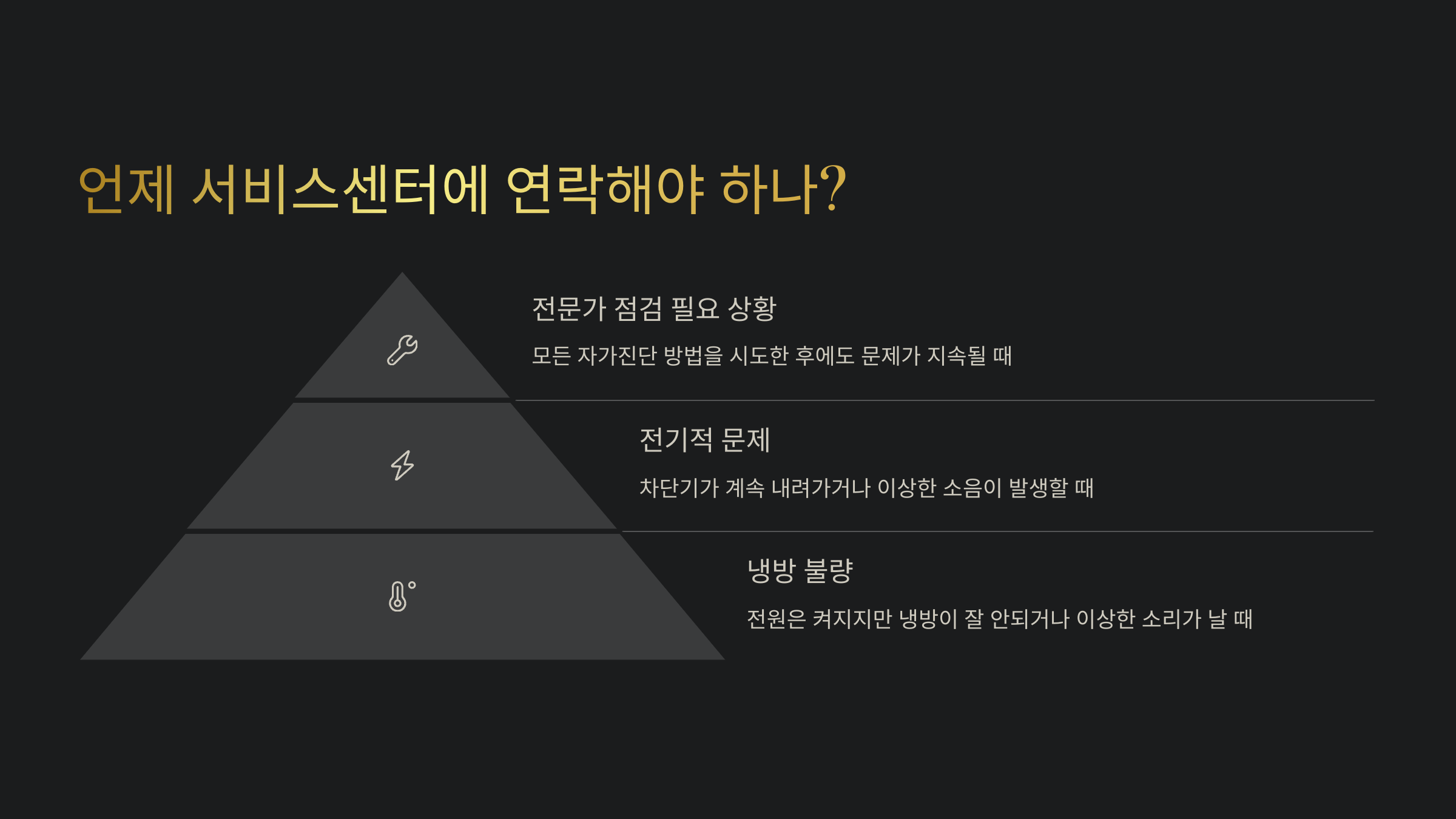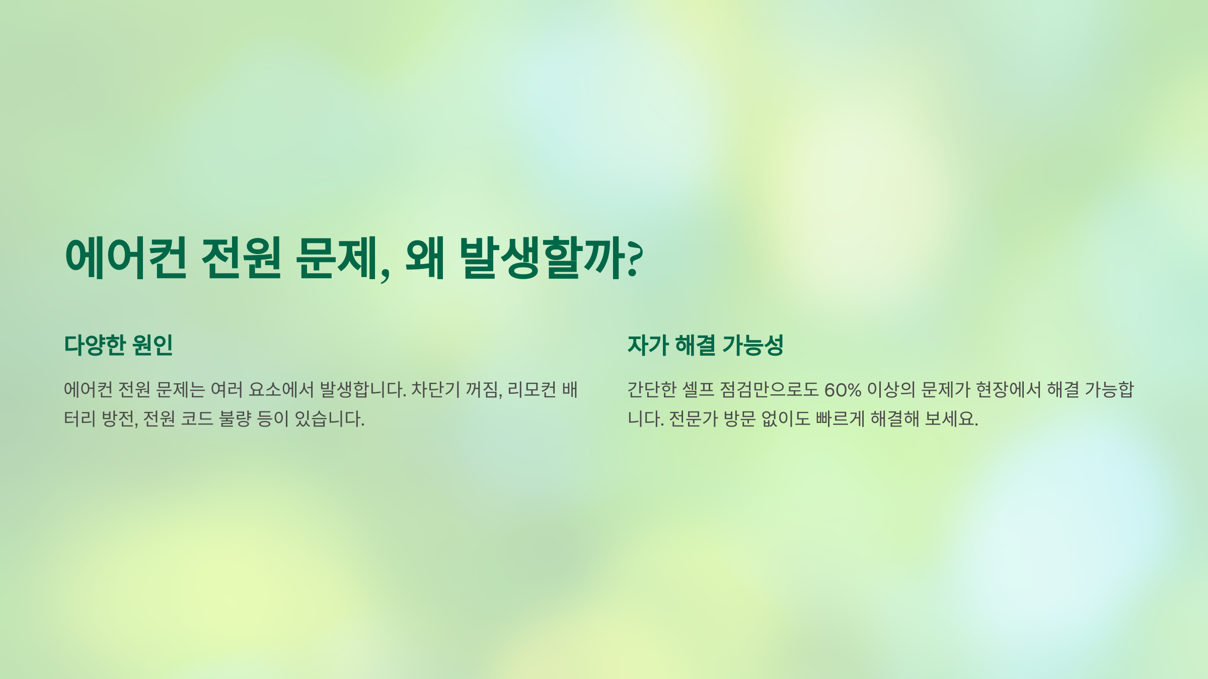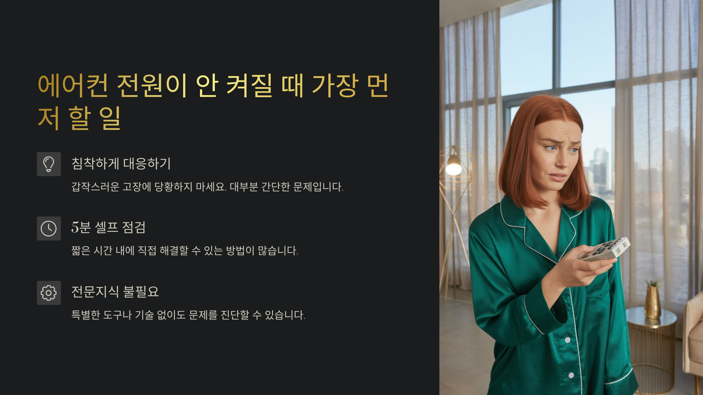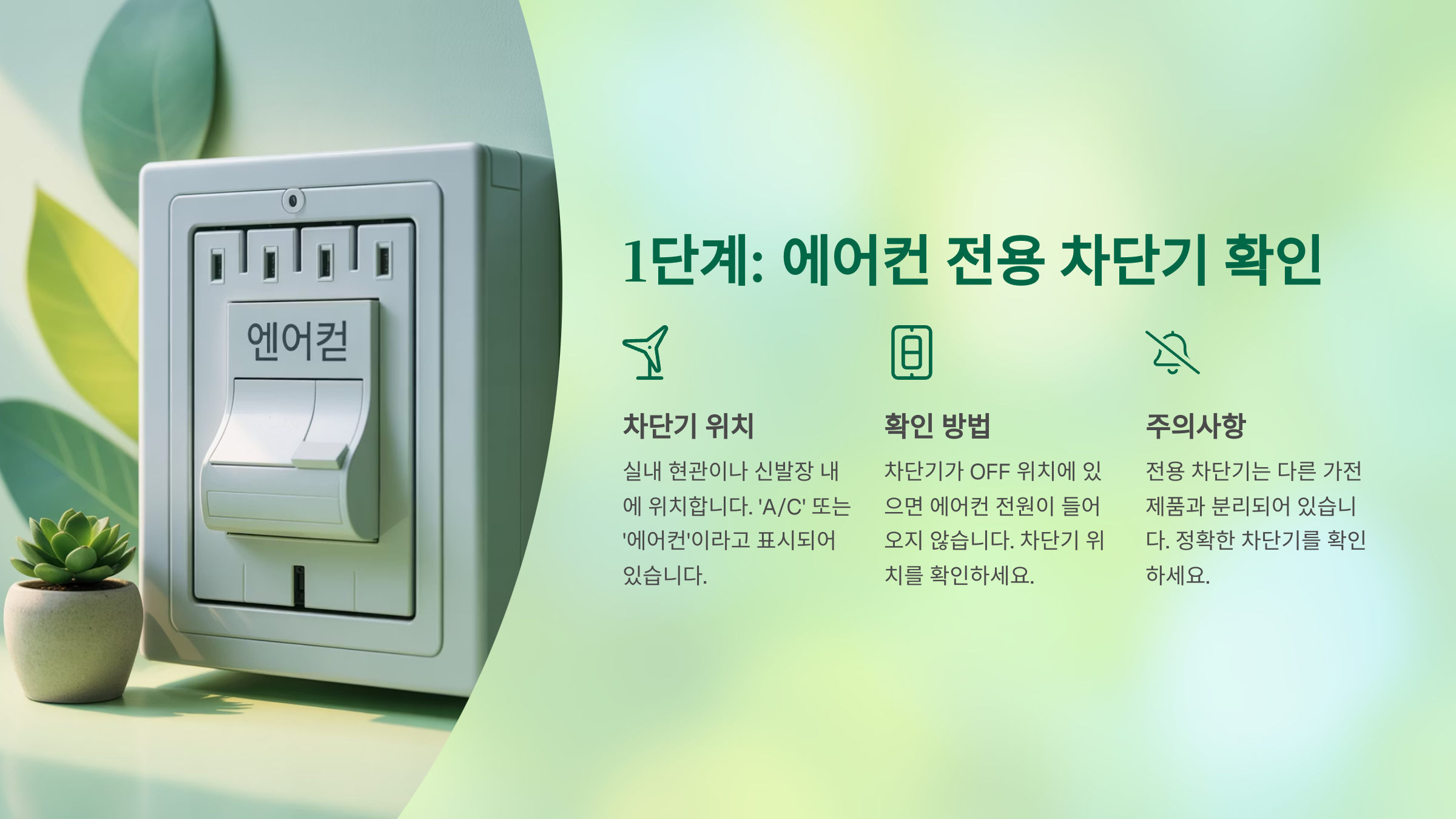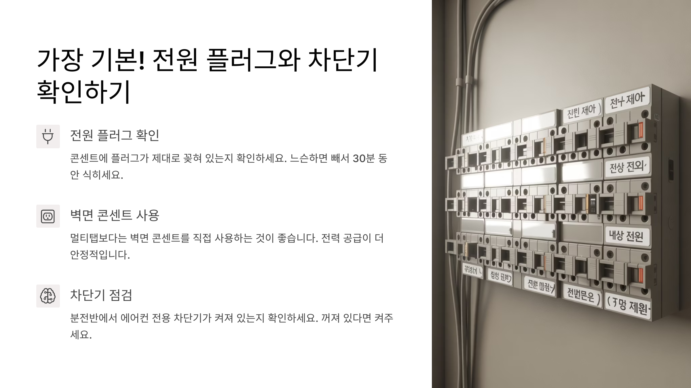 1⃣ 전원 확인: 콘센트와 '에어컨 전용' 차단기를 먼저 확인하세요.