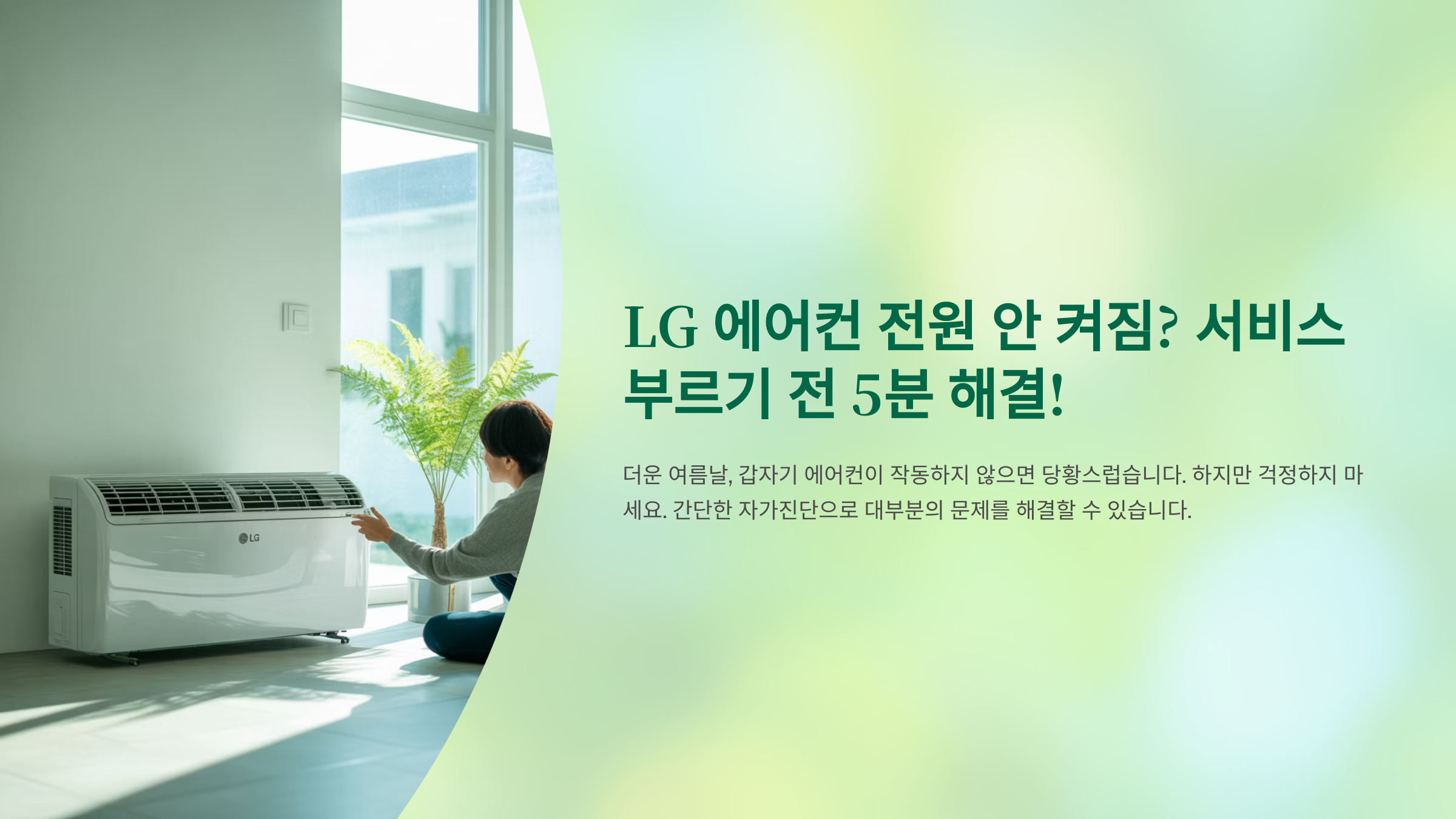 LG 휘센 에어컨 전원이 갑자기 안 들어오나요? 서비스센터에 연락하기 전에, 집에서 5분 만에 시도해볼 수 있는 간단한 해결 방법 4가지를 총정리했습니다. 이 글만 읽으면 땀 흘릴 일이 없을지도 몰라요!