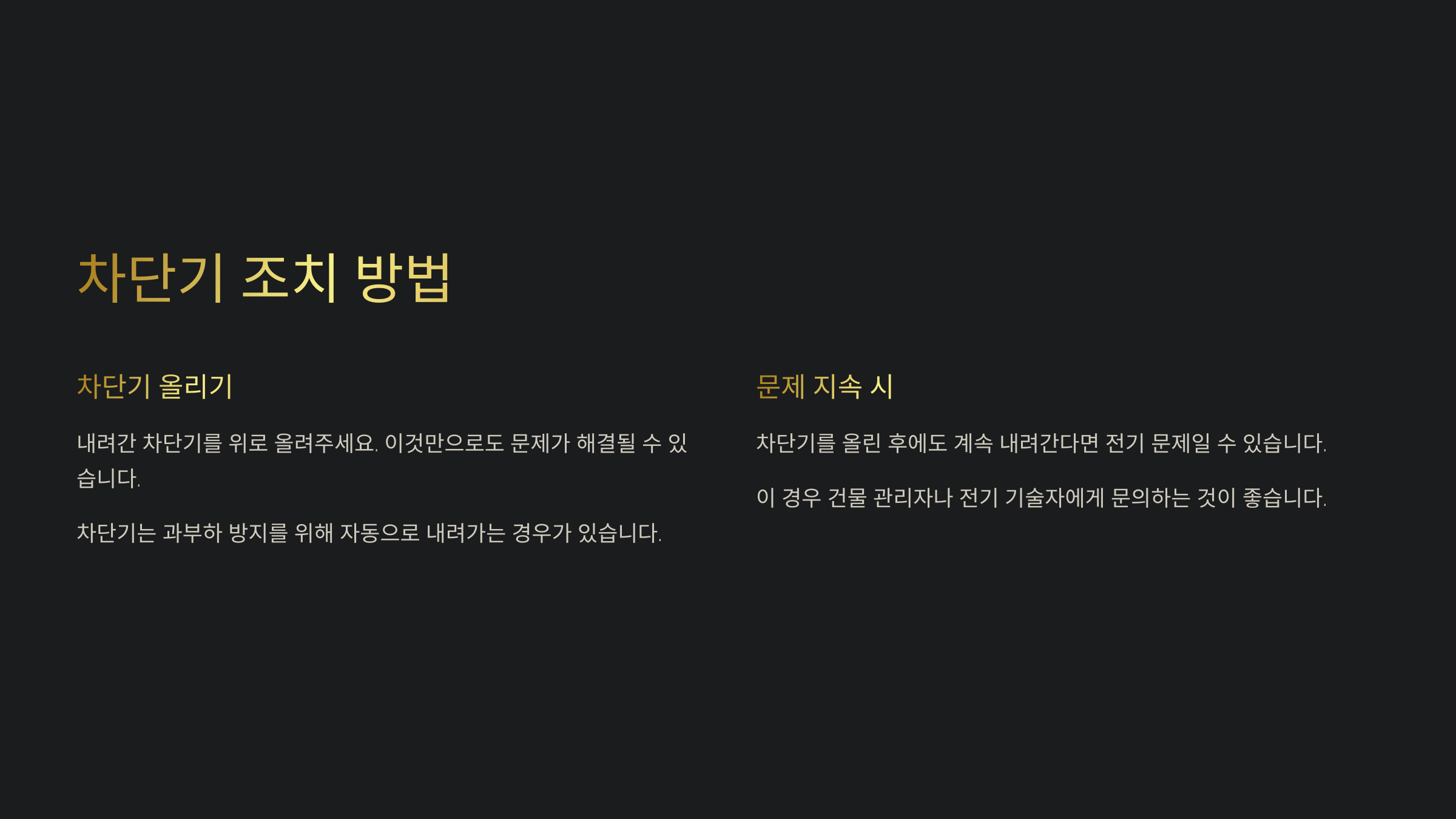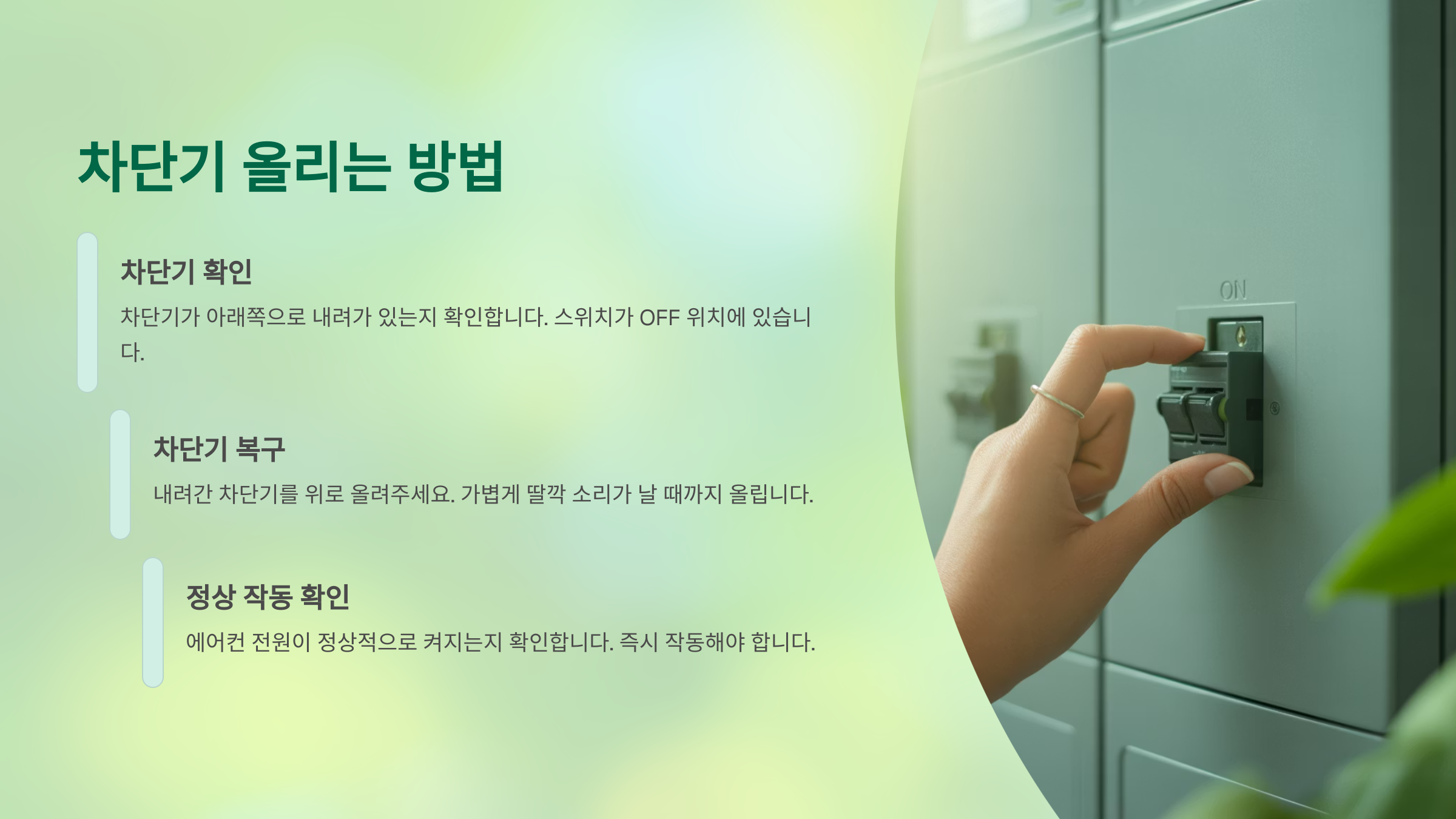 현관이나 신발장 근처에 있는 두꺼비집(분전함)을 열어보세요. 여러 개의 차단기 스위치 중에 '에어컨' 또는 'A/C'라고 표시된 것이 있는지 확인하고, 스위치가 아래로 내려가 있다면 위로 다시 올려주세요. 만약 올렸는데도 바로 '탁' 소리와 함께 내려간다면, 이건 전기 계통에 문제가 있을 수 있으니 즉시 전문가에게 문의해야 합니다.