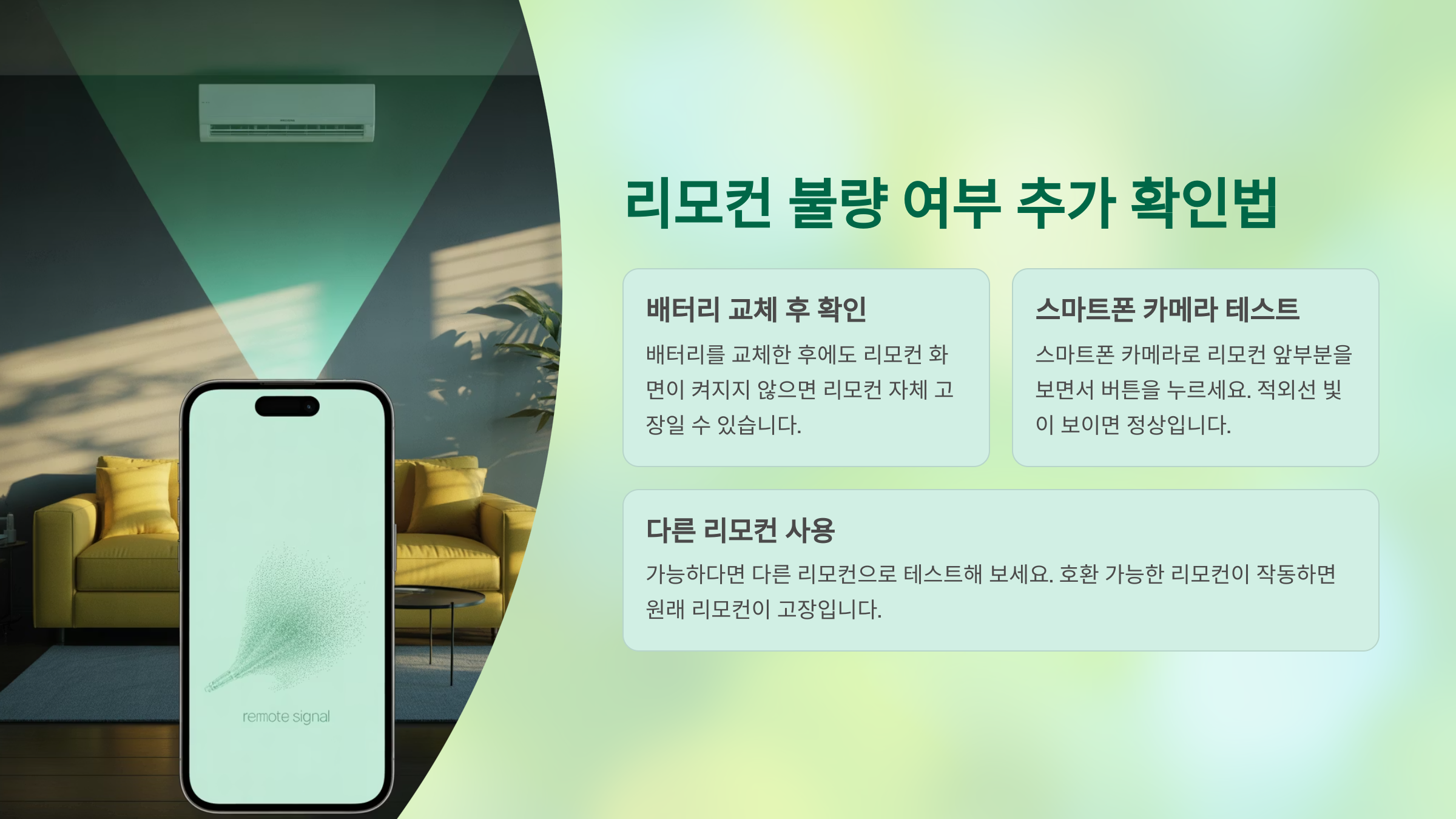2⃣ 리모컨 점검: 새 배터리로 교체하고, 스마트폰 카메라로 정상 작동 여부를 테스트해보세요.