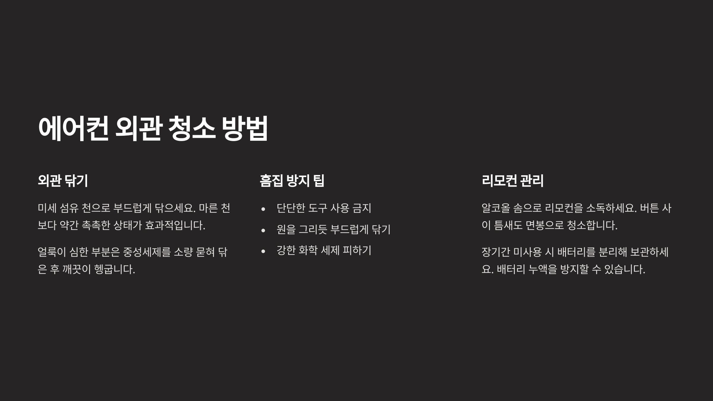 에어컨 외부 청소도 중요한데요, 먼지가 많은 곳에 설치되어 있다면 본체 외관을 주 1회 정도 물티슈나 극세사 천으로 닦아주는 걸 추천해요. 리모컨도 같은 방식으로 청소하면 위생적으로 관리할 수 있어요.