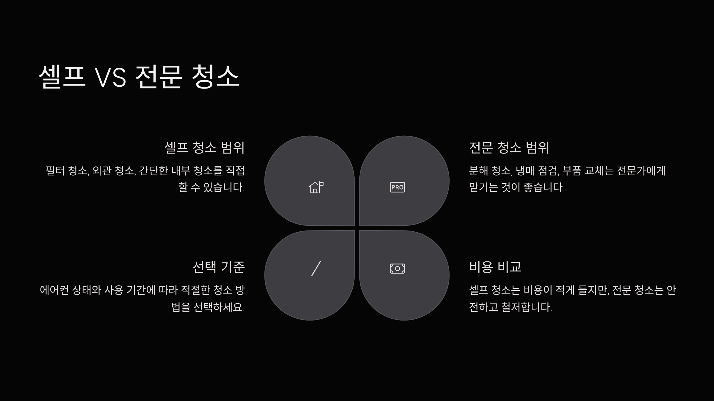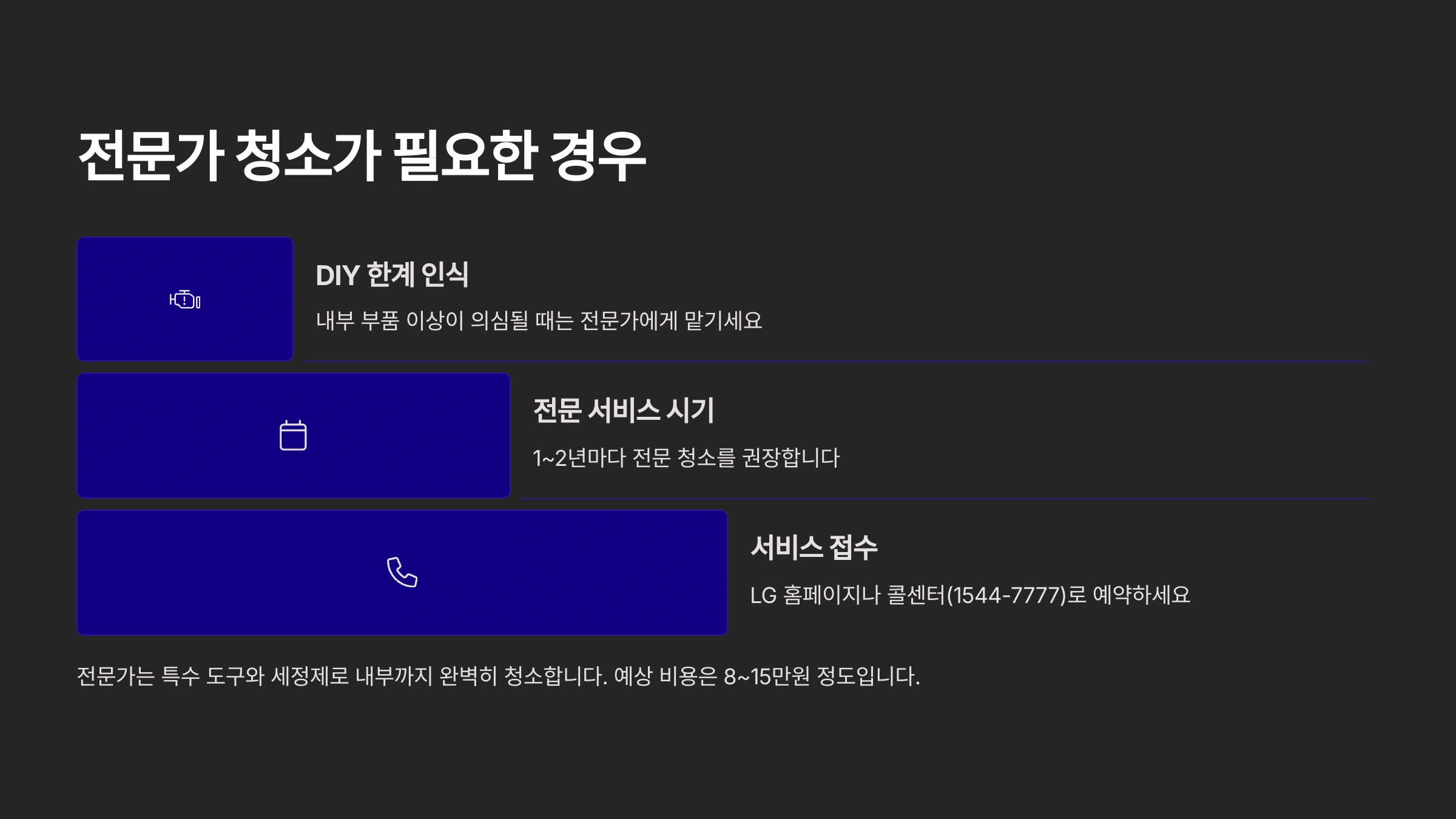 A6. 어렵거나 자신이 없다면 LG전자 공식 서비스 또는 전문 청소 업체에 의뢰하는 것도 좋아요. 비용은 5만~15만 원 정도예요.